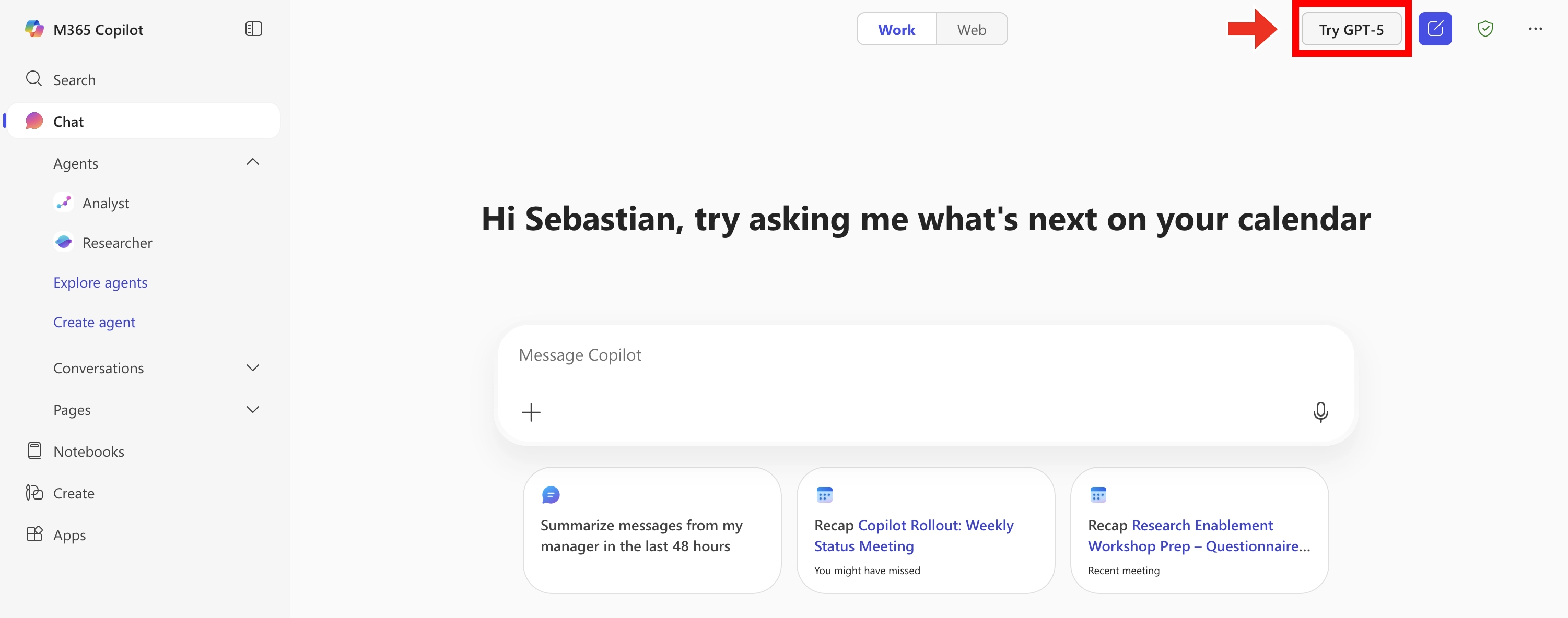 If you already have opted-in for a Copilot for Microsoft 365 license, GPT-5 is available now. to reason over both web and work data in Microsoft 365—including your calendar, emails, chats, documents, meetings, and contacts—to provide full contextual responses. Now, those with active Copilot for Microsoft 365 licenses will see a new "Try GPT-5" button in Copilot Chat (copilot.microsoft.com). Once activated, Copilot will use GPT-5 for that session. For users without a Copilot for Microsoft 365 license—e.g., those that only have access to Copilot on the Web—GPT-5 is starting to be rolled out and will be available in the coming weeks.